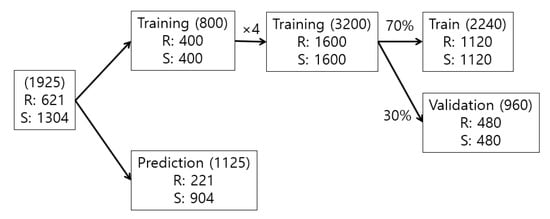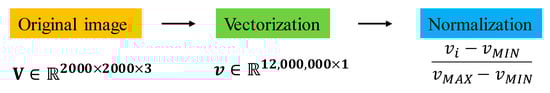 Figure 7 shows the preprocessing for machine learning on the collected image data. The original image data has a three-dimensional tensor structure, which does not directly apply to the machine learning library used in this study. We converted the 3-dimensional tensor data into 1-dimensional vector data, normalized them, saved them in CSV file format, and applied them to the machine learning model.