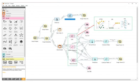 Machine-learning data are images taken at 15 dpi and 28 dpi. From three rounds of image capture, randomly select 400 images, each from TSWV-resistant and susceptible plants, totaling 800 images. Data augmentation technology improves model performance [9,10,24]. For simple geometric transformation, right-rotated, left-rotated, and vertically flipped images of the original photos were collected. The simulations for resistance determination were conducted using Orange3–3.36 software, employing models such as Support Vector Machine (SVM), Logistic Regression (LR), and neural networks (NNs). SVM is useful for finding complex boundaries, making it suitable for classification and regression, but it is computationally expensive for large datasets (Figure 8, Figure 9 and Figure 10). For agricultural applications of computer vision, it is important to have a method that is accessible to non-specialists. Orange Software was selected, as it meets this need effectively.