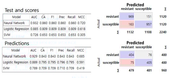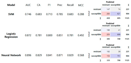Based on modeling performance, the superiority of the NN model was confirmed. Next, the prediction performance of the NN model was verified. As a result, in the validation set of 960 images not used for training, the NN model also achieved the highest prediction accuracy, with a CA of 0.843. Using the developed model, TSWV infection was predicted for the remaining 1125 images. Among the neural network (NN), Logistic Regression (LR), and Support Vector Machine (SVM) models, the neural network model showed the highest classification accuracy, at 0.829 (Figure 10).