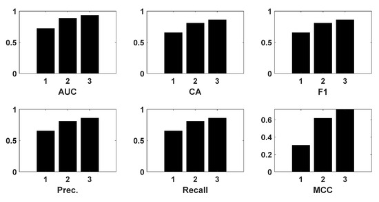 Modeling performances. AUC is the area under the receiver operation characteristic curve, with a range of 0~1. CA, F1, Prec., Recall, and MCC are defined from (1) to (5), where 1 on the horizontal axis is LR, 2 is SVM, and 3 is NN.