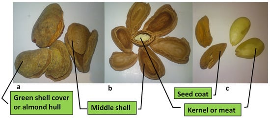 The almond fruit is an ellipsoidal drupe, consisting of four portions: kernel or meat, middle shell, outer green shell cover or almond hull and a thin leathery layer known as the meat’s brown skin, or seed coat (Figure 1). Figure 1 shows the differentiation of mature almond parts. Figure 1a,b shows the inedible lignified parts (almond hull and middle shell) and Figure 1c shows the edible parts (kernel and seed coat).