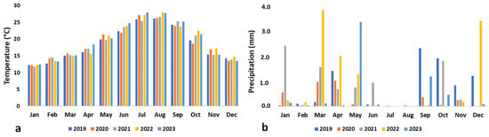 The climate is characterized as continental. The hot season lasts for about 3 months, from June 15 to September 15, with an average daily high temperature above 26 °C. The warmest month of the year is July, with an average high temperature of 30 °C and a low of 14 °C. The cool season lasts for 4 months, from November 15 to March 15, with an average daily high temperature below 14 °C. The coldest month of the year is January, with an average low temperature of −2 °C and a high of 9 °C (Figure 2a). The driest month is July, with 2 mm of average precipitation, and most precipitation falls in March–April (24 mm); the annual accumulated rainfall is less than 100 mm (Figure 2b). There is little variability in annual temperatures, but rainfall is highly variable from one year to the next. Climate data come from an official weather station (Latitude: 36°50′07″ N; Longitude: 02°24′ 08″ W).