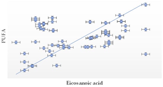 To evaluate this possible relationship between eicosanoic fatty acid and PUFA, all cases where double-entry data are available have been taken (eicosanoic/PUFA) (Figure 3). The result obtained shows a positive and direct relationship, so that part of the PUFA content of almonds could be used directly in the synthesis of eicosanoic acid.
