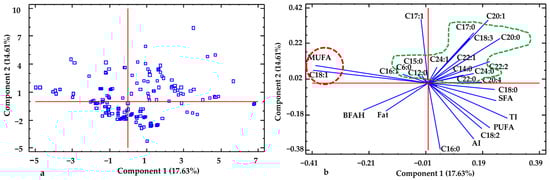 From the Principal Component Analysis of fat in almonds, 10 factors with eigenvalues greater than or equal to 1.0 have been extracted. Together, these factors explain 83.34% of the variability in the original data. PCA of data from fat components of almonds in the study generated a plot with scores (Figure 4a) and loadings (Figure 4b) of the first two components as follows: PC1 (17.63%) and PC2 (14.61%). The first two components explain 32.24% of total variance. The first component (PC1) was positively correlated to the identified groups (Figure 4b). A weight close to 0 indicates little contribution of the variable in that component.