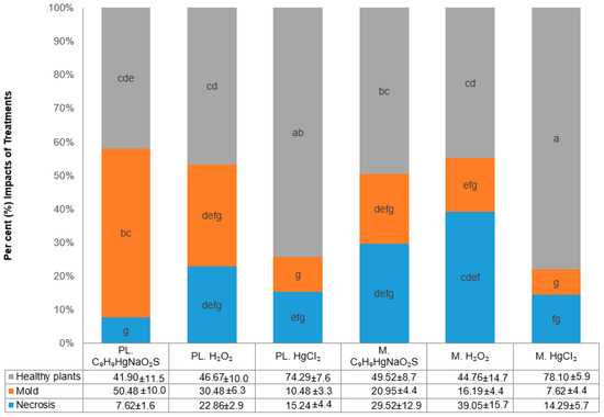 However, according to morphometric indicators (the number of leaves, the degree of their development, the height of the microplants), the explants of the two cultivars varied greatly and their condition was assessed as satisfactory. When applying 0.01% C9H9HgNaO2S for 10 min, the percentage of necrosis formation in ‘Podarok Leta’ decreased by 13% compared to ‘Marmeladnitsa’, but, at the same time, the proportion of mold increased (Figure 1 and Figure S2). This reduced the quantitative indicators of obtaining healthy microplants.