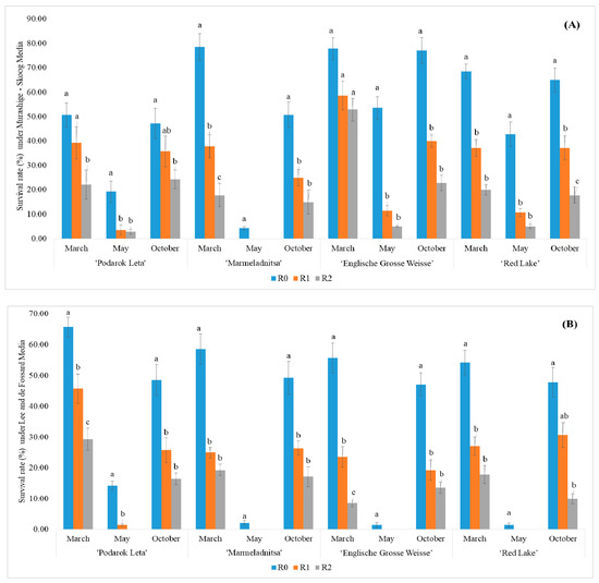 The effect of the period of introduction into in vitro culture and the passage number (R0 -R2) on the survival rate (%) of red currants, depending on the components of the nutrient mediums of MS (A) and LF (B). «No bars» indicates that the microplants are dying. According to the Tukey’s Honest Significant Difference (HSD), for each parameter, bars with different letters are significantly different (p < 0.05).