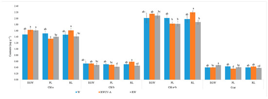 The impacts of different lighting sources, including W: White spectrum, RWUV-A: Red with a White and Ultraviolet spectrum, and RW: Red with a White spectrum on the chlorophyll and carotenoids contents of different red currant cultivars. EGW— ‘Englische Grosse Weisse’; PL—‘Podarok Leta’; RL—‘Red Lake’. According to the Tukey’s Honest Significant Difference (HSD), for each parameter, bars with different letters are significantly different (p < 0.05).