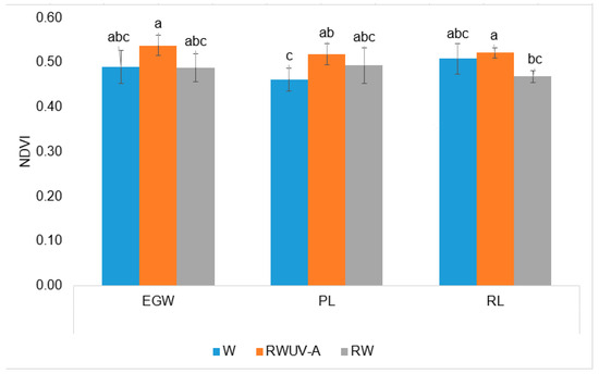 The impacts of different lighting sources, including W: White spectrum, RWUV-A: Red with a White and Ultraviolet spectrum, and RW: Red with a White spectrum on the Normalized Difference Vegetation Index (NDVI) of different red currant cultivars. EGW—‘Englische Grosse Weisse’; PL—‘Podarok Leta’; RL—‘Red Lake’. According to the Tukey’s Honest Significant Difference (HSD), for each parameter, bars with different letters are significantly different (p < 0.05).