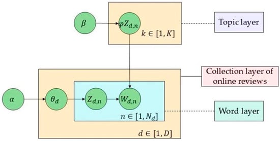 The probabilistic framework of the topic extraction model is illustrated in Figure 2. Initially, N words are extracted, which obeys the distribution of . Subsequently, the topic distribution across the online reviews is formatted from . For each of words , its corresponding topic is first identified, where . Based on , the corresponding word Wn is generated. Here, serves as the prior parameter for the multinomial distribution of topics under any single comment, serves as the Dirichlet prior parameter for the multinomial distribution of characteristic words under this topic, and represents the overall topic distribution across the comments. denotes the total number of topics; denotes the total number of comments; denotes the total number of words in the d-th comment. represents the n-th word in the d-th comment; and respectively denote the topic distribution in the comment and the characteristic word distribution under the topic; denotes the topic of the word in the comment [31].