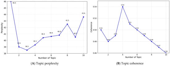 Perplexity is a commonly used evaluation metric in LDA topic modeling, and is primarily used to assess how well the model fits the data. The concept of perplexity originates from information theory in probabilistic models, reflecting the model’s ‘uncertainty’ or ‘level of confusion’ regarding the test data. Lower perplexity values indicate better clustering performance, suggesting that the model is more successful in capturing the underlying structure of the data. This is visually represented in Figure 4A, which provides a graphical representation of the perplexity scores for different numbers of topics, allowing us to identify the point at which the model achieves the most optimal balance between complexity and coherence [32,33].