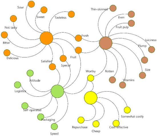 Based on the insights gleaned from the LDA topic model, it can provide a more detailed analysis and interpretation of each topic as shown in Figure 5. In this figure, it can be seen that there are four centers corresponding to each topic, where each contains numerous high-frequency keywords. Some key works are unique to a single topic, and some are shared across other topics, indicating the interrelatedness of different consumer concerns. Topic 1 was characterized by words that are intimately associated with the quality of tangerines such as ‘fresh’, ‘even’, ‘thin-skinned’, ‘moisture’, and ‘sweet’. These words reflect the attributes of tangerines that consumers prioritize, particularly regarding their appearance and intrinsic quality. The word ‘fresh’ indicates that consumers place a high premium on the freshness and recently harvested state of the fruit, while ‘even’ suggests that they expect consistency in size, color, and other characteristics. Descriptors like ‘thin-skinned’ and ‘moisture’ underscore the importance of texture and juiciness, which are pivotal in the fruit selection process. Consequently, Topic 1 is aptly categorized as ‘Quality’, signifying that consumers are highly concerned with the physical attributes and quality standards of the product.