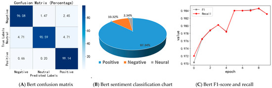 To illustrate the suitability of SnowNLP for short reviews, particularly in the context of e-commerce, we conducted text classification experiments using the f model. For this purpose, a subset of the reviews was manually annotated to form a dataset for the classification task. The BERT model was then trained and tested on this dataset, and its performance was evaluated using the confusion matrix, recall, and F1-score, with the results presented in Figure 7. The confusion matrix (Figure 7A) provides a visual representation of the model’s performance in a three-class classification task, with the accuracy of each class indicated on the diagonal. Specifically, the accuracy for the positive class was 99.14%, 90.59% for the neutral class, and 96.8% for the negative class. These high accuracy rates demonstrate the BERT model’s effectiveness in distinguishing from different sentiment categories.