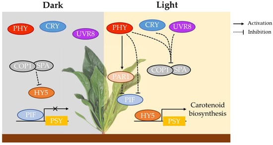 Light signaling pathways regulating carotenoid biosynthesis. In darkness, the CONSTITUTIVELY PHOTOMORPHOGENIC 1/SUPPRESSOR OF PHYA-105 (COP1/SPA) E3 ligase represses ELONGATED HYPOCOTYL 5 (HY5, an activator of carotenoid transcription) and stabilizes the PHYTOCHROME-INTERACTING FACTOR (PIF, a repressor of carotenoid transcription). Upon exposure to light, active photoreceptors such as PHY, CRY, and UVR8 regulate the ligase, enabling HY5 to bind the PSY (a key enzyme of carotenoid biosynthesis) gene promoter and activate carotenoid metabolism. PHYTOCHROME RAPIDLY REGULATED 1 (PAR1) inhibits the activation of PIF under shade. Concurrently, active PHY promotes the rapid ubiquitination and degradation of PIF [27]. Meanwhile, PAR1 functions as a repressor of PIF under low light intensity.