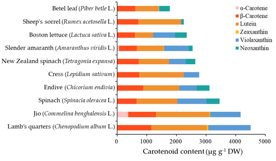 Carotenoids in leaves are essential for photosynthesis, primarily functioning in light energy harvesting and photoprotection. Carotenoids are integral components of the photosystems, assisting chlorophyll in light harvesting and enhancing photosynthetic efficiency. This characteristic significantly enhances photosynthetic efficiency. However, excessive light absorption not only reduces photosynthetic efficiency but also generates ROS in the photosynthetic electron transport chain, leading to oxidative damage in chloroplasts. Plants have developed various mechanisms to mitigate oxidative stress under high-light conditions, including leaf structural adaptations, PHOT-mediated chloroplast rearrangement, and antioxidant activity [38]. Carotenoids contribute to photoprotection by detoxifying ROS generated during photosynthesis. In chloroplasts, carotenoids primarily exist in a protein-bound form near chlorophyll molecules within light-harvesting complexes and reaction centers, while some remain as free forms in the membrane [18]. Their primary functions are recognized as preventing the formation of ROS by quenching photosensitizer molecules in their excited state, directly quenching ROS, or scavenging ROS [19]. Leaf carotenoids—β-carotene, lutein, violaxanthin, neoxanthin, and zeaxanthin—vary in composition and abundance depending on species and environmental conditions. Many studies have reported the carotenoid composition and contents of various leafy vegetables [39,40,41,42,43]. Based on these data, we analyzed carotenoid levels in approximately 50 leafy vegetables (Table S1) and identified 10 species particularly rich in carotenoids (Figure 2). In Figure 2, lamb’s quarters are the leafy vegetable with most abundant carotenoid content (4497.9 μg g−1 DW), followed by jio, spinach, endive, cress, New Zealand spinach, slender amaranth, Boston lettuce, sheep sorrel, and betel leaf. The top 10 carotenoid-rich vegetables consistently exhibit high lutein and β-carotene levels. Violaxanthin is also a major carotenoid in most vegetables, except betel leaf and sheep sorrel, where it is present only in trace amounts (36.7 and 14.5 μg g−1 DW). However, violaxanthin is present in all 10 vegetables regardless of the quantity. On the contrary, the presence or absence of other carotenoids depends on the vegetable species. Neoxanthin is present in seven vegetables (77.0–440.0 μg g−1 DW), while it is not detected in cress, jio, or lamb’s quarters. Zeaxanthin is present in betel leaf, slender amaranth, jio, and lamb’s quarters in small amounts (below 50 μg g−1 DW). α-carotene is present in slender amaranth (67.5 μg g−1 DW) and jio (371.7 μg g−1 DW).