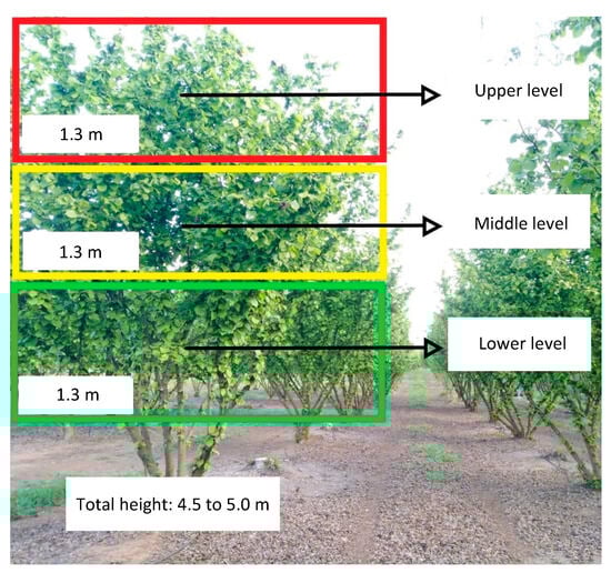 The experiment was conducted using a factorial design with two factors: (i) planting-density pruning (canopy management) and (ii) canopy levels. The planting density consisted of (1) a planting density of 5 × 3 m (between and above the rows, respectively) without production pruning; (2) a planting density of 5 × 6 m (between and above the rows, respectively) without production pruning; and (3) a planting density of 5 × 3 m (between and above the rows, respectively) with production pruning. For each planting-density pruning, five representative plants (replicates) were selected to measure the light interception at three canopy levels: (1) upper, (2) middle, and (3) lower (Figure 1). Each level had an approximate height of 1.3 m, starting the counting 60 cm from the base of the tree since it is considered a non-productive zone. This section division resulted in a total plant height of approximately 5.0 m, as shown in Figure 1.