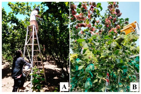 In the plants established at a planting density of 5 × 3 m with production pruning, all the fruits on the plants were individually bagged at each height level using colored bags (red, yellow, and green) to differentiate them. The bags had perforations that allowed light penetration, as shown in Figure 2B. Fruits were harvested on 15 April 2020, and yield and quality measurements were taken for each height level. The harvest was performed by collecting the individual bags whilst shaking the branches and immediately counting the number of fruits per plant and replication. The fruit quality parameters such as vain, sucker, double, bug, and healthy hazelnuts and the yield components such as the number of fruits, total fruit weight in grams and grams per individual fruit were evaluated visually and using a digital balance when corresponding. Vain fruits corresponded to the fruits that presented the absence of a kernel, whereas sucker fruits corresponded to fruits that had their kernels shriveled. Bug fruits corresponded to those affected by bugs, showing necrotic spots on the kernel.