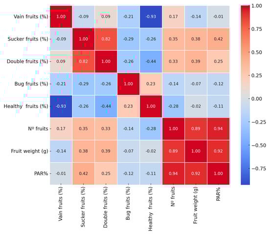 The PAR was strongly correlated to the number of fruits (+0.94) and fruit weight (+0.92) and moderately correlated to the percentage of sucker fruits (−0.42). The fruit weight was strongly correlated to the number of fruits (+0.89) and moderately correlated to sucker and double fruits (+0.38 and +0.39, respectively). The number of fruits was moderately correlated to sucker and double fruits (+0.35 and +0.33, respectively). The percentage of healthy fruits was strongly correlated to the percentage of vain fruits (−0.93) and moderately correlated to double fruits (−0.44). The percentage of double fruits was strongly correlated to the percentage of sucker fruits (+0.82) (Figure 3).