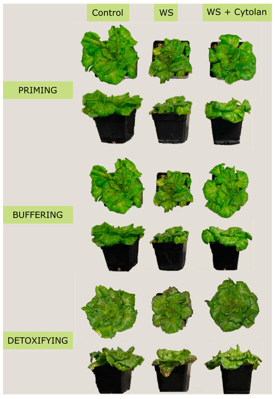 Photograph showing the priming, buffering, and detoxifying effects of Cytolan® Stress application on lettuce plants subjected to water stress.