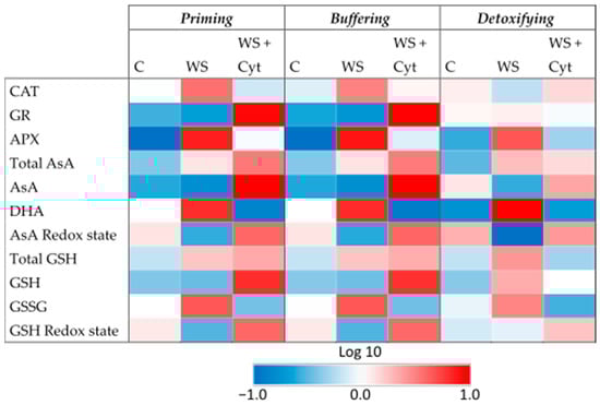 Heat map showing the priming, buffering, and detoxifying effects of Cytolan® Stress on antioxidant enzyme activities and AsA and GSH form concentrations in lettuce plants. Color scale refers to the logarithmic transformation (log10) of measured values (higher values are shown in red, lower values in blue, and intermediate values in white colors). To interpret the color code, refer to Supplementary Tables S1 and S2.