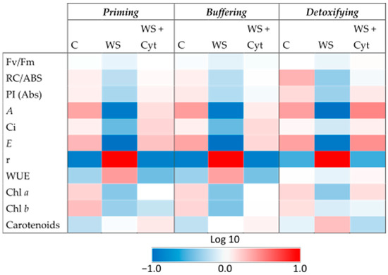 Heat map showing the priming, buffering, and detoxifying effect of Cytolan® Stress on photosynthesis-related parameters in lettuce plants. Color scale refers to the logarithmic transformation (log10) of measured values (higher values are shown in red, lower values in blue, and intermediate values in white colors). To interpret the color code, refer to Supplementary Table S1.