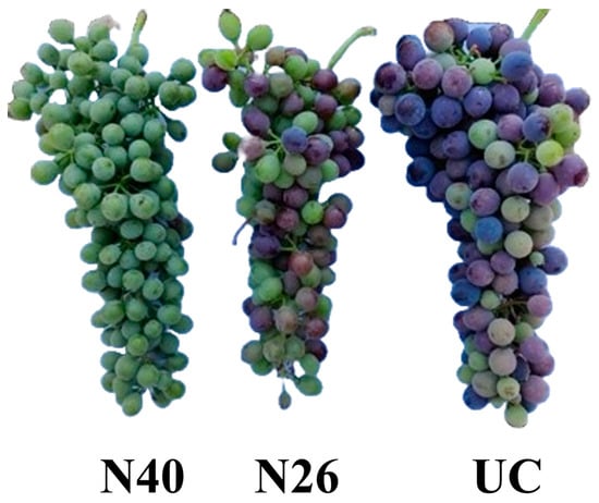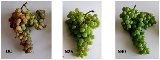 Photographs of grape clusters from Grillo cultivar for treatments UC, N26, and N40, taken near harvest. These images provide a visual representation of the percentage of berries affected by sunburn, dehydration, and those remaining healthy, as detailed in Table 6.