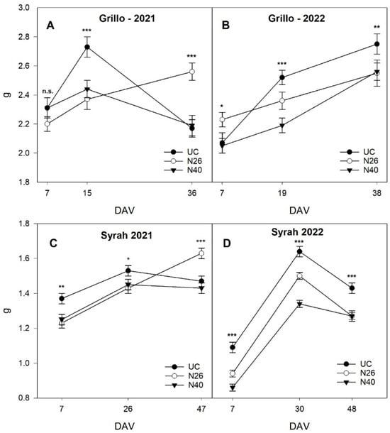 Mean berry weight with standard error for each treatment. Subplot (A) illustrates the berry weight for the Grillo variety in 2021, subplot (B) for Grillo in 2022, subplot (C) for Syrah in 2021, and subplot (D) for Syrah in 2022. Significance levels are indicated as follows: * p < 0.05, ** p < 0.01, *** p < 0.001. “n.s.” indicates non-significant differences.