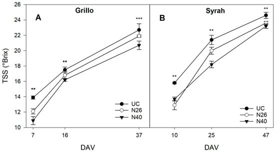 Total soluble solids content (Brix) for the three treatments (UC, N26, N40) across different time points. Subplot (A) shows the Brix content for Grillo and subplot (B) shows the Brix content for Syrah. Values are presented as means with standard errors. Significance levels are indicated as follows: ** p < 0.01, *** p < 0.001.