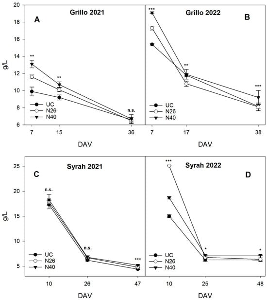 Total acidity (TA) measured for each treatment, presented as means with standard errors. Subplot (A) shows the TA for the Grillo variety in 2021, subplot (B) for Grillo in 2022, subplot (C) for Syrah in 2021, and subplot (D) for Syrah in 2022. Significance levels are indicated as follows: * p < 0.05, ** p < 0.01, *** p < 0.001. “n.s.” indicates non-significant differences.