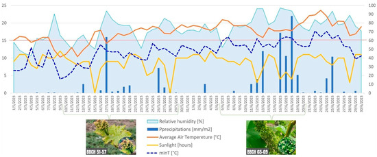 Graphical representation of the climatic conditions from the grapevine pre-flowering (BBCH 51-57) and flowering phenophases (BBCH 65-69) at SCDVV Blaj in 2023.