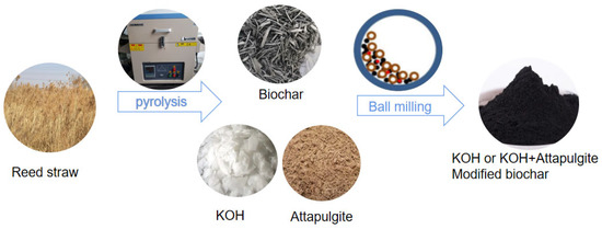 Bulk biochar (YC) preparation referred to the optimal preparation parameters of biochar found in our previous studies [20]. Briefly, the reed straw was cut into 2–3 cm pieces after air drying and anaerobically fired in a high temperature tubular furnace (OTF-1200X, Hefei Kejing Material Technology Co., Ltd., Hefei, China), then filled with inert nitrogen by heating at the rate of 20 °C per minute, remaining at 600 °C for 30 min and cooling for 2 h. After firing, it was cooled, ground and evenly mixed, and passed through a 100-mesh sieve. After mixing the YC with potassium hydroxide (KOH, purchased from Xilong Chemical Company, Shantou, China) according to the mass ratio of 1:10 or KOH + attapulgite (purchased from Xuyi Xinyuan Company, Huaian, China) according to the mass ratio of 0.5:0.5:10, they were placed in a ball mill (Type BM40, Beijing Gredeman Instrument Equipment Co., Ltd., Beijing, China), ground at 300 rpm for 4 h, and put in a sealed bag for later use. The biochar modified by ball milling with either the addition of KOH alone (QK) or combined with attapulgite (QKA) were prepared. The preparation flow chart of modified biochar can be seen in Figure 1.