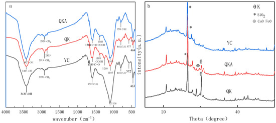 The images of infrared spectrum (a) and XRD spectrum (b). Note: Bulk biochar (YC); biochar modified by ball milling with addition of KOH alone (QK) or combined with attapulgite (QKA).