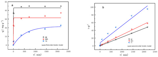 Kinetic fitting curve of adsorption Cd by QK, QKA and YC treatments (a). fitted by quasi-first-order kinetic model, (b). fitted by quasi-second-order kinetic model). Note: Bulk biochar (YC); biochar modified by ball milling with addition of KOH alone (QK) or combined with attapulgite (QKA).