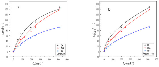 Isothermal adsorption curves for Cd in QK, QKA and YC treatments (a) fitted by Langmuir adsorption isotherm model, (b) fitted by Freundlich adsorption isotherm model). Note: Bulk biochar (YC); biochar modified by ball milling with addition of KOH alone (QK) or combined with attapulgite (QKA).