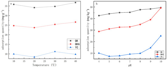 Figure 6a shows the effect of QK, QKA and YC on Cd adsorption at 10–40 °C. It demonstrates that the Cd removal rate by QK and QKA was always higher than that of YC at any temperature. The adsorption capacity of Cd by QK and QKA was promoted in parallel with the increasing temperature; with the highest values of 36.76 and 26.59 mg·kg−1, respectively; while that of YC fluctuated slightly with the increase in temperature, but also showed an overall upward trend. This result indicates that the Cd adsorption process by biochar was endothermic, and higher temperatures were more conducive to the removal of Cd [34].
