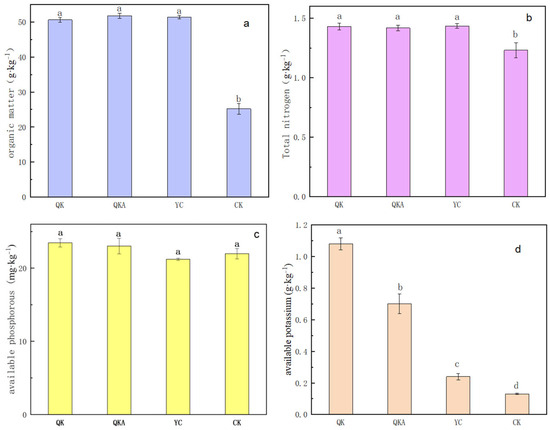Influence of modified biochar on soil nutrient contents: (a) organic matter, (b) total nitrogen, (c) available phosphorus, (d) available potassium. Note: Error bars represent the standard deviation of triplicate samples. Different letters indicate a significant difference at p < 0.05; bulk biochar (YC); biochar modified by ball milling with addition of KOH alone (QK) or combined with attapulgite (QKA).