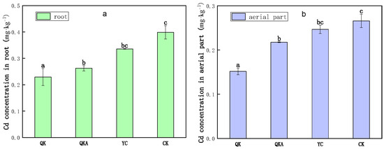 Influence of modified biochar on Cd accumulation by Chinese cabbages: (a) in root, (b) in aerial part. Note: Error bars represent the standard deviation of triplicate samples. Different letters indicate a significant difference at p < 0.05; bulk biochar (YC); biochar modified by ball milling with addition of KOH alone (QK) or combined with attapulgite (QKA).