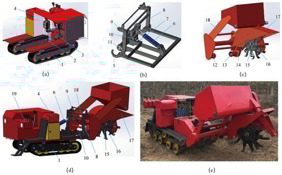 Self-propelled orchard ditching machine. (a) Power chassis module, (b) lifting regulator module, (c) ditching–fertilizer module, (d) schematic diagram of SPODM, and (e) actual image of SPODM. 1. Crawler travel unit; 2. power output shaft I; 3. diesel engine; 4. hydraulic oil tank; 5. hanging hook; 6. adjustment oil cylinder; 7. power input shaft I; 8. adjustment frame; 9. suspension pliers; 10. reduction gearbox; 11. power output shaft II; 12. suspension arm; 13. power input shaft II; 14. transmission box; 15. ditching cutter disc; 16. soil breaking shovel; 17.soil covering hood; 18. suspension beam; and 19. control unit.