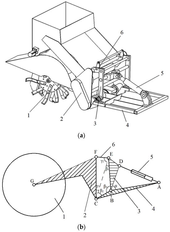 The lifting adjustment mechanism of orchard ditching machine: (a) structure diagram and (b) kinematic sketch. 1. Ditching cutter disc; 2. ditching cantilever; 3. rocker; 4. rack; 5. telescopic cylinder; 6. connecting rod.
