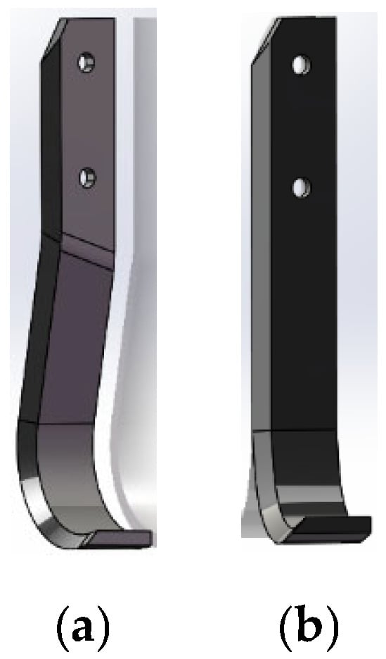The side-cutting plane of blade A is designed with a bending angle β of 15°. The bending design of the side-cutting edge reduces the installation spacing between the blades on the two sides, thus effectively weakening the working resistance to the intermediate groundbreaking shovel. The lateral soil-cutting angle γ of the side-cutting edge (torsion angle of the side-cutting plane along the vertical plane) is designed to be 5°; increasing the soil-cutting angle increases ditching resistance. The bending angle α of the tangent plane is designed to be 65° and the bending radius r is designed to be 45 mm. When the bending radius is too small, the soil can easily adhere to the bending arc; when it is too large, it increases the unevenness at the furrow bottom after operations. The blade width W is designed to be 45 mm and the side-cutting edge length L is designed to be 105 mm.