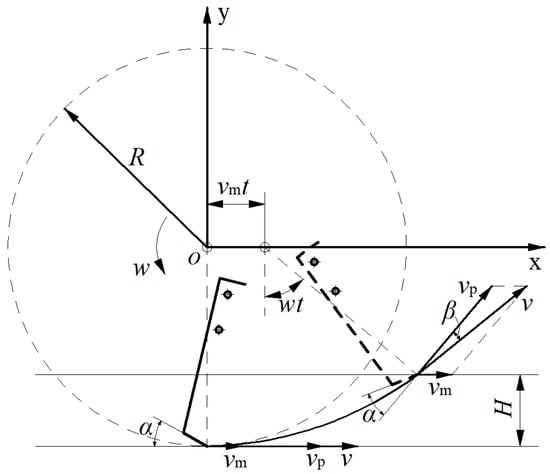 Figure 6 illustrates the motion sketch of the ditching cutter disc. It can be observed that the rotation speed of the cutter disc and the advancing speed of the ditching machine are ω and vm, respectively; thus, the circumferential speed vp of the blade top is calculated by Equation (4).