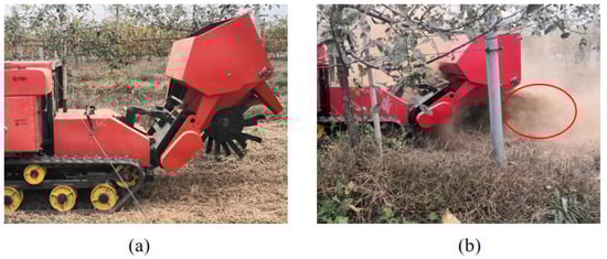 Photos of the machine working in orchard: (a) before ditching and (b) during ditching. Note: The red circle in subfigure (b) is to illustrate the soil state during the ditching process.