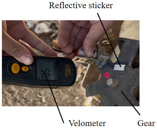 In this study, the rotational speed of each experimental treatment was measured by the handheld velometer. The model of the velometer was an AR926 photoelectric (non-contact) (Smart Sensor Instrument Group Co., Ltd., Hongkong, China), with a speed measurement range of 2.5–999,999 rpm, a resolution of 0.1 rpm (2.5–999.9 rpm), and an effective measurement distance of 50–500 mm. Firstly, a reflective sticker was stuck on the gear of the cutter disc. When the photoelectric signal emitted by the velometer shines on the reflective sticker, it will reflect the light back to the velometer. By calculating the time interval of the reflected signal, the speed of the cutter disc can be calculated, as shown in Figure 8.