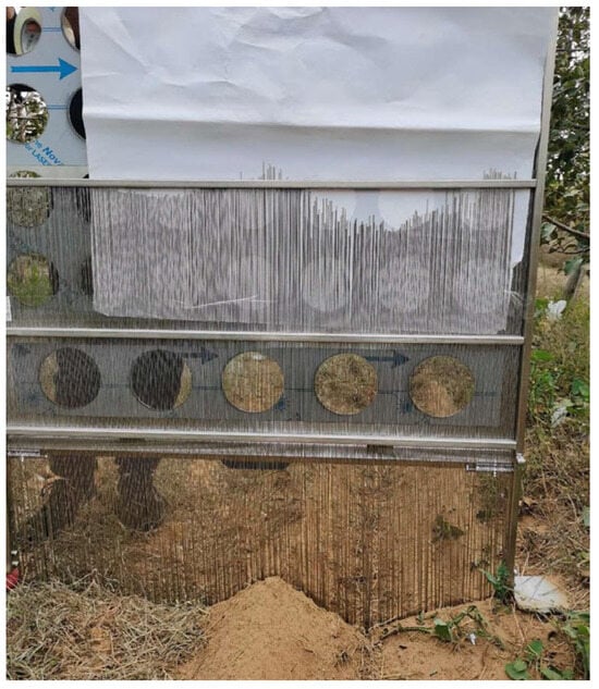 In this study, the furrow profiles were measured using a custom-made furrow cross-sectional profile meter (shown in Figure 9), which consists of several groups of probes capable of moving freely up and down. Each probe, 1.5 mm in radius and 1000 mm in length, moves vertically along the furrow cross-sectional profile and eventually stops at a specific position. The position of each probe tip is marked with a pen. Subsequently, all marked positions are connected to form the surface furrow profile after the ditching and backfilling operations. After each orchard ditching and backfilling test, three sites along the advancing direction were randomly selected to measure the surface furrow profile. In this study, the furrow profile was defined as a V-shaped furrow if there were significant sharp corners at the bottom of the furrow. On the contrary, if the contour of the furrow bottom presented a smooth curve, it was defined as arc-shaped.
