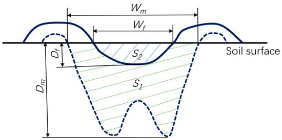 Figure 10 illustrates the furrow cross-sections during the ditching and backfilling operations. The blue dotted line represents the maximum ditching furrow cross-section (without any soil backfill) during the ditching process, created by the action of bilateral cutter discs; the blue solid line represents the surface furrow cross-section after the completion of the ditching and backfilling operations (i.e., after backfilling is completed). In Figure 10, S2 denotes the furrow cross-sectional area after the ditching and backfilling operations; S1 + S2 denotes the maximum furrow cross-sectional area formed during the ditching process; Dm denotes the maximum furrow depth; Wm denotes the maximum ditching width; Df denotes the final furrow depth; and Wf denotes the final furrow width.