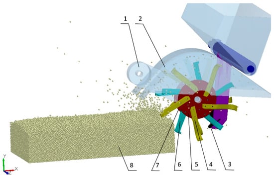 Simulation model of ditching and backfilling process. 1. Power transmission unit; 2. covering hood; 3. soil breaking shovel; 4. blade A; 5. cutter disc (left); 6. blade B; 7. cutter disc (right); and 8. soil particles.