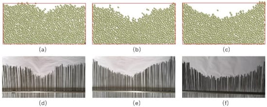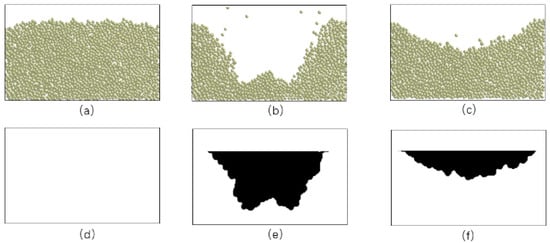 Soil ditching and backfilling process using the 03# cutter disc. (a–c) The original images of the initial furrow cross-section, the maximum furrow cross-section, the final furrow cross-section, the section of the soil before the blade is put into the soil, the maximum ditching area condition, and the final soil condition; (d–f) the Matlab processed images of the initial furrow cross-section, the maximum furrow cross-section, and the final furrow cross-section.