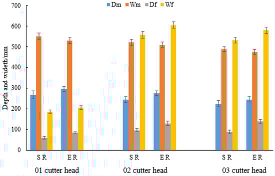 The relative errors between the experimental and simulated values for maximum furrow depth (Dm) and width (Wm) were smaller. Across all cutter discs, the mean relative error for Dm was 9.44% and that for Wm was 3.00%. Experimental Dm was slightly higher than the simulated value, likely due to measurement errors, while Wm was marginally greater than the experimental values, possibly from measurement or simulation inaccuracies. Additionally, the 01# cutter disc surpassed 02# in Dm by 7.27% and in Wm by 3.92%. Similarly, compared to the 03# cutter disc, 01# exceeded in Dm by 12.24% and in Wm by 7.37%. For the simulation results, although the maximum furrow depth Dm value of the 02# cutter disc was greater than that of the 03# cutter disc, the difference was insignificant (p = 0.088).