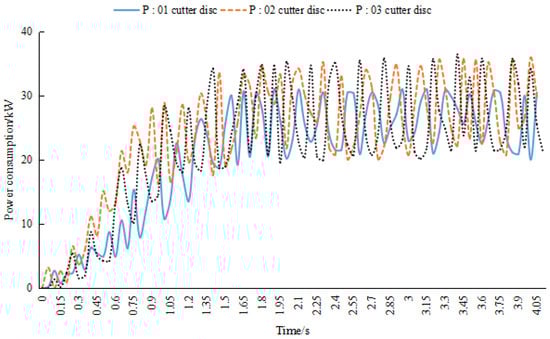Based on the EDEM simulation model, the total torque of the cutter disc is obtained at each moment during the ditching process. These data provide insights into the forces acting on the cutting tool during ditching. Utilizing the torque data and Equation (11), the power consumption for ditching can be calculated accurately. This calculation helps in understanding the energy requirements and efficiency of the ditching process, facilitating optimization and performance enhancement.