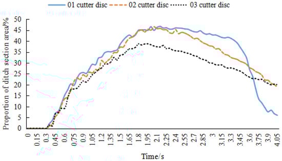 The ditching and backfilling processes under the three cutter disc types were compared, and Figure 16 demonstrates the changes in the furrow cross-sectional area caused by the gradual backfilling after ditching. In the initial period, the blades driven into the soil induced soil disturbance and threw partially cut soil. However, they did not produce any obvious furrow cross-sectional area in the first circle of rotation. Subsequently, with the blades being driven into and out of the soil repeatedly, the furrow cross-sectional area increased rapidly until reaching the maximum furrow cross-sectional area. The proportions of the maximum furrow cross-sectional areas (S1 + S2) formed by the 01# and 02# cutter discs (46.70% and 46.52%) were notably higher than that formed by the 03# cutter disc (38.71%).
