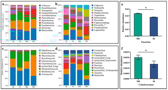 The similarity of microbial community composition in each soil sample was analyzed using principal coordinates analysis based on the Bray–Curtis algorithm. A total of 30.54% (Figure 2c) and 42.70% (Figure 2d) of the sample information is explained by the two main coordinates, PC1 and PC2 axes, for bacteria and fungi, respectively, in the graph. The ADONIS test showed that there was a significant difference in the composition of the soil microbial community structure between the ginseng monoculture and ginseng—A. amurense intercropping treatments (Bacteria: R2 = 0.411, p = 0.001; Fungi: R2 = 0.585, p = 0.001). The results presented in the figure demonstrate that the fungal samples from MR and MN are situated nearby, while the bacterial samples from IR and IN exhibit a similar pattern. However, the fungal and bacterial samples from IR and IN are notably separated from the MR and MN. The results indicate that the fungal and bacterial communities in the inter-root soil of ginseng plants were significantly altered by the practice of intercropping with A. amurense, resulting in a notable change in the structural composition of the microorganisms present in the inter-root region of the ginseng plants.